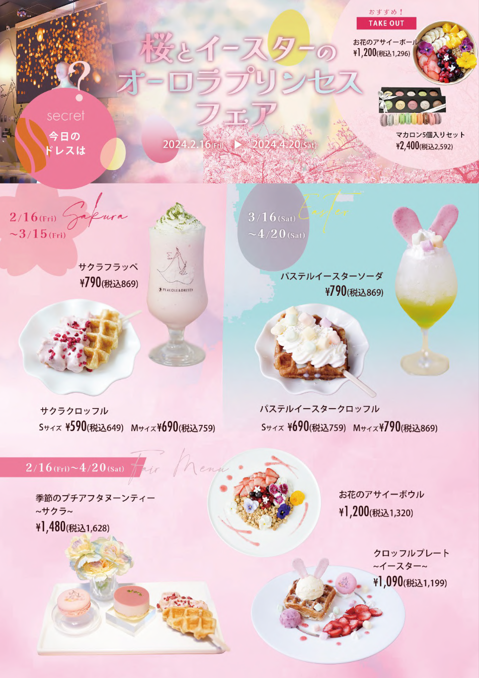 2/16〜4/20迄、春らしい可愛らしさを感じる、『桜とイースターのオーロラプリンセスフェア』を開催。リニューアルした店内で、一足先に春を感じていただけます。2/16〜3/15と3/16〜4/20の期間でそれぞれ違ったフェトジェニックな期間限定メニューもご用意。