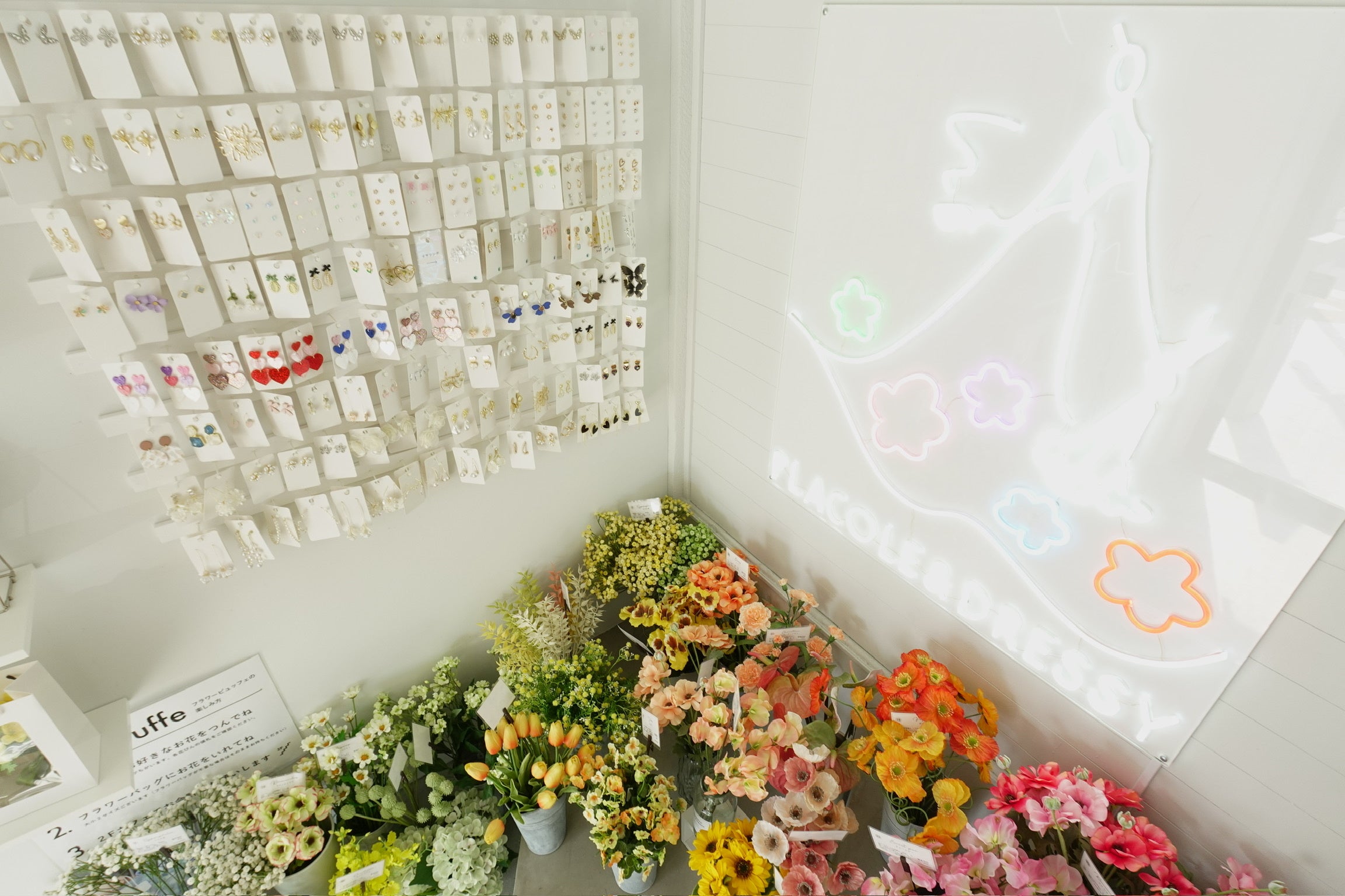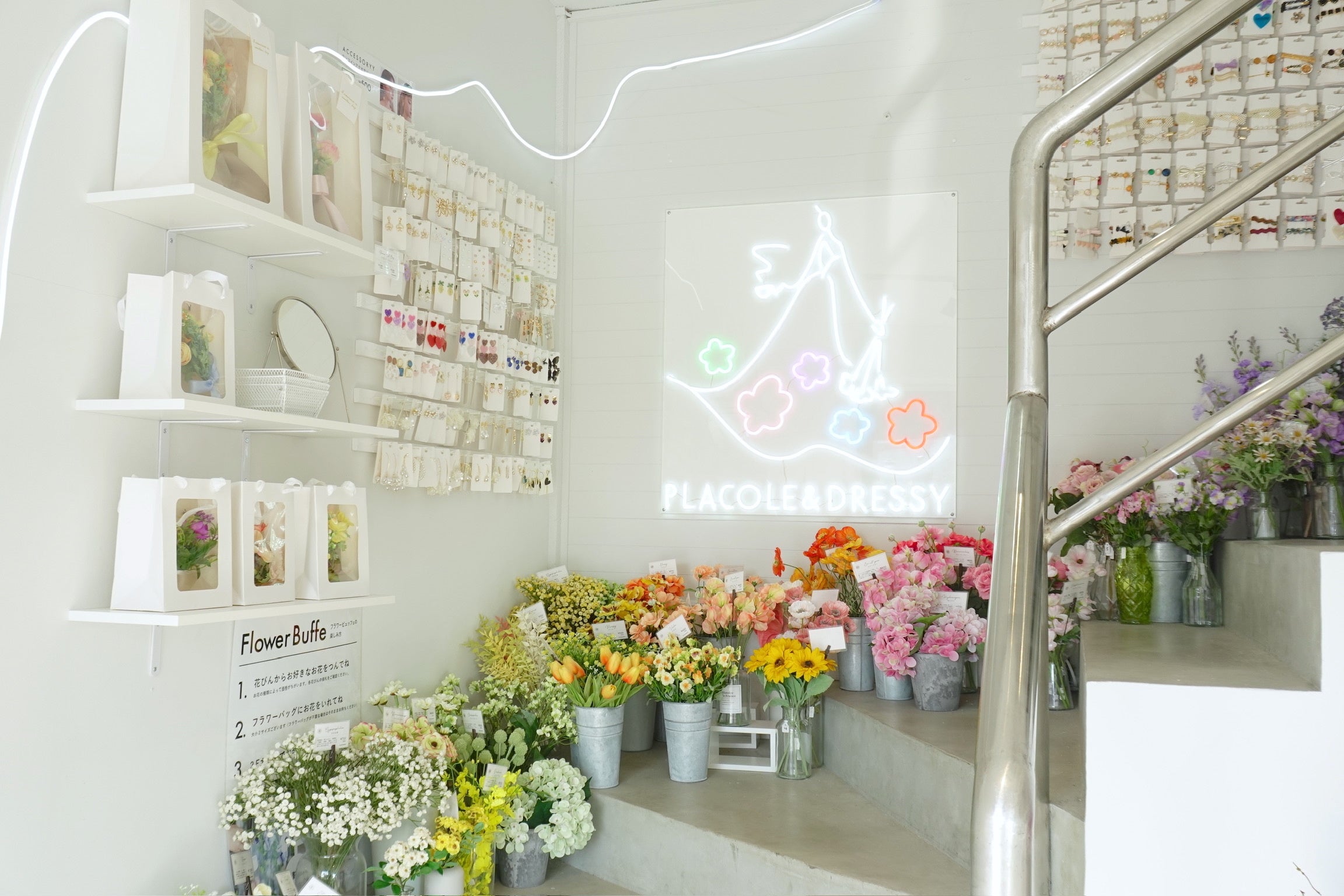 2階につづくネオンラインをたどるとそこにはたくさんのアーティフィシャルフラワーが飾られています。お好きなお花を袋にいれて持ち帰れるフラワービュッフェの体験も可能。また、鮮やかなアーティフィシャルフラワーを束ねた、ブーケバックも新登場。
