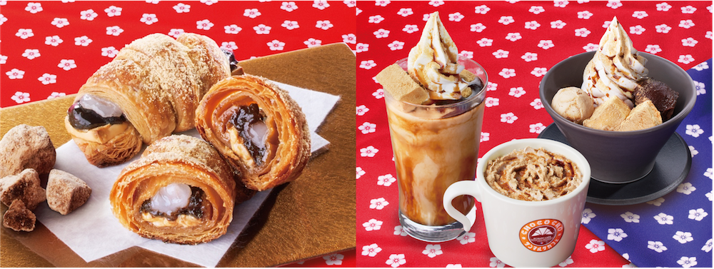 濃厚で上品な「桔梗信玄餅」の味わいを表現した『プレミアムチョコクロ 桔梗信玄餅 ~黒糖入り生地&黒みつきな粉もち~』やスムージー、ホットラテ、パフェの4種が登場