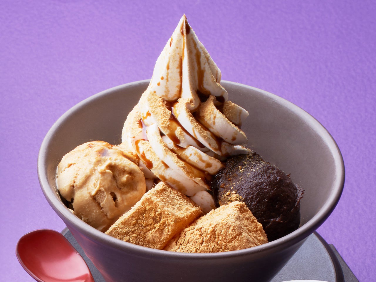 濃厚なソフトクリームや、きな粉と黒みつソースを混ぜ込んだ和風の味わいが楽しめるマーブルアイス、厳選した黒みつを使用した濃厚でコク深い味わいのある黒みつクリームに加えて、わらびもちを贅沢に盛り付けたパフェ。さらに仕上げにはきな粉と黒みつを全体にかけた、きな粉と黒みつ尽くしの濃厚で香り豊かなデザートです。