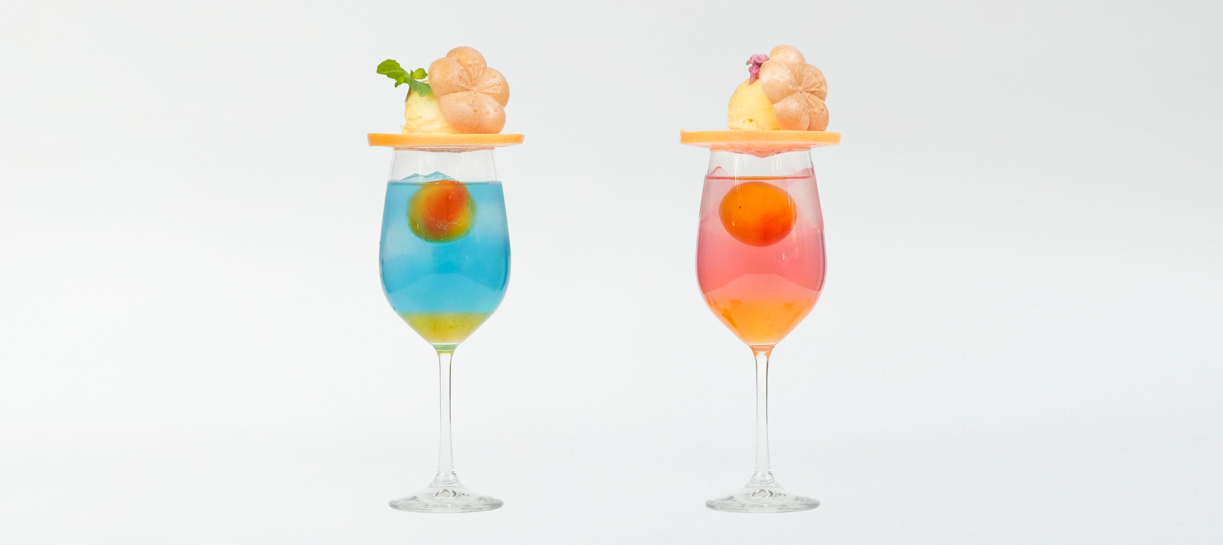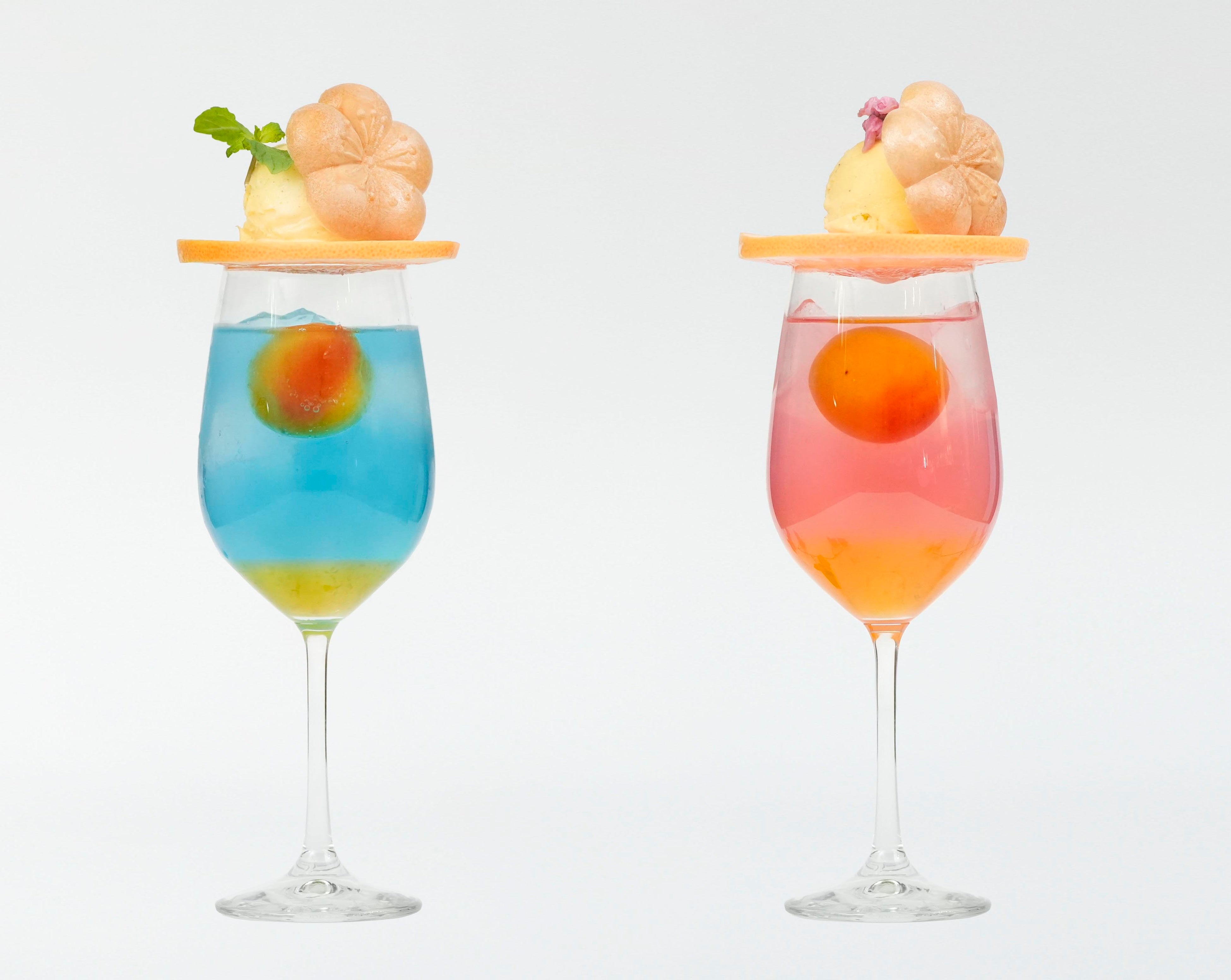 バタフライピーや桜など花由来のオリジナルシロップと紀州産南高梅を掛け合わせ、春らしい柔らかな日差しが届いて、のどかに晴れている麗らかな情景や満開の桜の花色に染まった情景を表現しました。