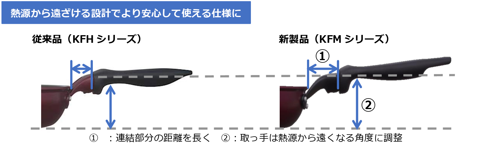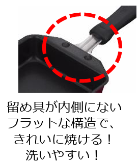 今回のリニューアルでは、さらに取っ手を持ちやすく、洗いやすくするため、取っ手の厚みを薄くしました。さらに取っ手背面の凹凸も少ない設計で、手への負担を軽減。また、取っ手を熱源から遠ざける設計にしてより安心して調理できるよう改良しました。