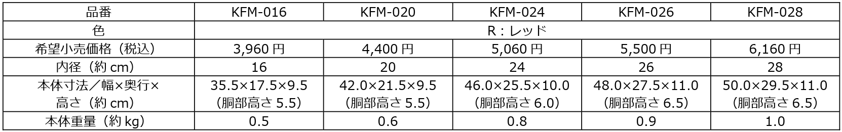 16cm、20cm、24cm、26cm、28cmの5サイズ展開