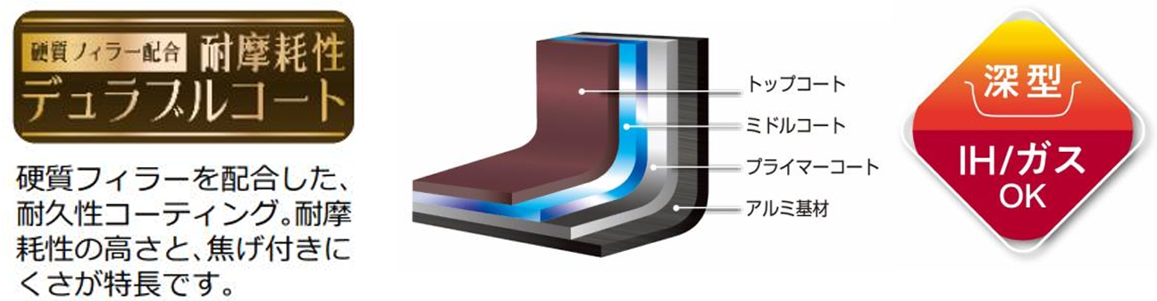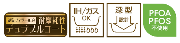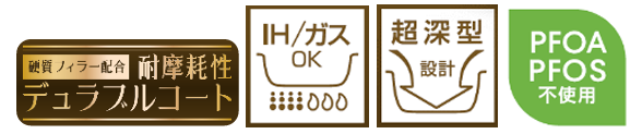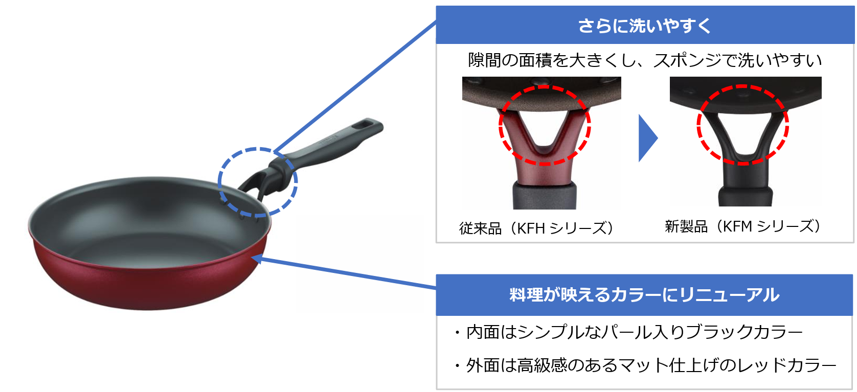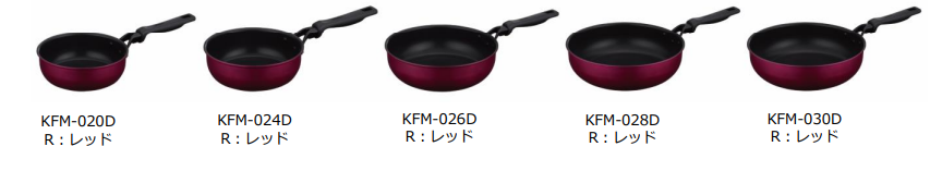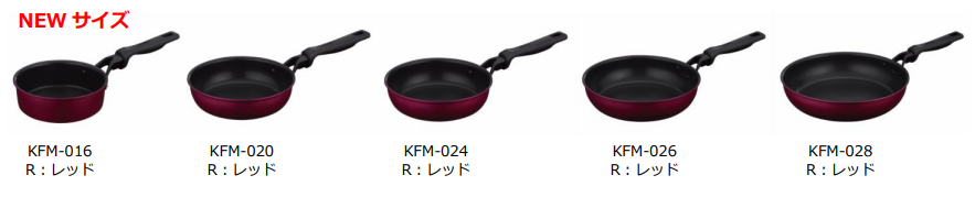 このたび深型設計で IH・ガス火対応のKFHシリーズのフライパン、炒め鍋、玉子焼きフライパンをリニューアルします。リニューアルした『KFMシリーズ』は、耐久性コーティングや蓄熱性に優れた仕様はそのままに、より持ちやすく、お手入れしやすい取っ手となりました。料理が映えるカラーリングを採用しております。