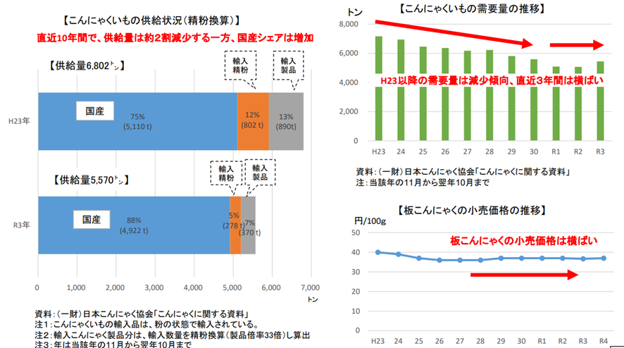 ただ近年、日々の食生活の多様化や感染症等による外食・中食需要の低下などにより、こんにゃくの消費量は年々下がり続けており、40年前と比べると2分の1程度の消費量と危惧され始めています。