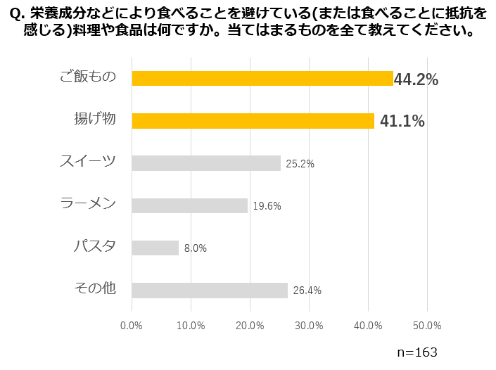 食べることを避けている(または抵抗を感じる)料理や食品の内容を尋ねたところ、上位にあがったのは「ご飯もの」(44.2%)、「揚げ物」(41.1%)でした。