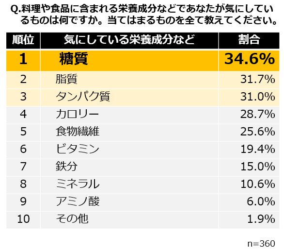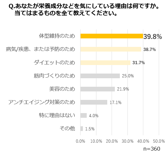 栄養成分などで気にしているものを聞いたところ、最も多くの人が選択したのは「糖質」(34.6%)でした。次いで、「脂質」(31.7%)、「タンパク質」(31.0%)の順に気にしている人が多い結果となりました。また、栄養成分などを気にしている理由として上位にあがったのは、「体型維持のため」(39.8%)、「病気/疾患、または予防のため」(38.7%)、「ダイエットのため」(31.7%)となりました。