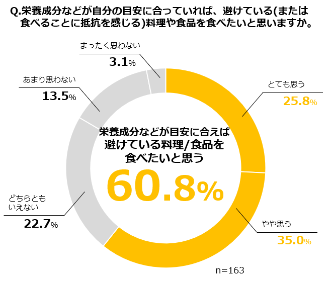 食べることを避けている(または抵抗を感じる)料理や食品がある人に対し、栄養成分などが自分の目安に合っていれば避けている料理や食品を食べたいと思いますかという質問には、25.8%の人が「とても思う」、35.0%の人が「やや思う」と回答しました。合計60.8%の人が、栄養成分が自分の目安に合えば食べたいという結果となりました。
