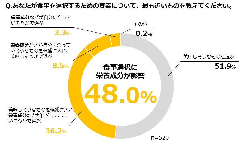 残りの約半数(48.0%)の人は、「美味しそうなものを候補に入れ、栄養成分などが自分に合っていそうかで選ぶ」(36.2%)、「栄養成分などが自分に合っていそうなものを候補に入れ、美味しそうかで選ぶ」(8.5%)、「栄養成分などが自分に合っていそうかで選ぶ」(3.3%)と回答し、約半数の食事選択には栄養成分が影響していることが明らかになりました。
