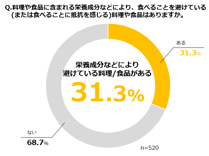 料理や食品に含まれる栄養成分などにより、食べることを避けている(または食べることに抵抗を感じる)料理や食品はあるか聞いたところ、「避けている料理/食品がある」と回答した人は31.3%に達しました。