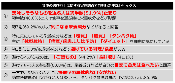 今回の調査結果から、食事選択時に栄養成分などが重視されている実態と共に、その裏側に、栄養成分などで避けられている料理/食品があることが明らかになりました。また、栄養摂取量の目安がある人は1割程度とまだ少なく、具体的な目安がないまま糖質や脂質が少なくタンパク質が多い料理/食品が求められ、食事の選択肢を狭めている可能性も見えてきました。