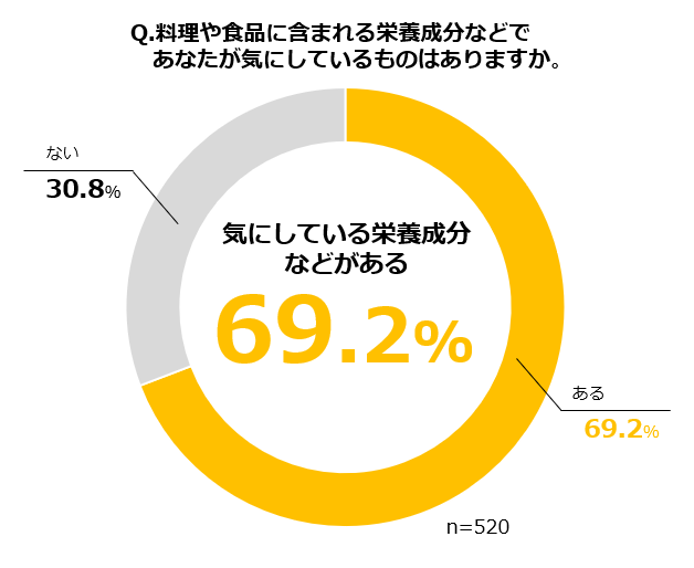 料理や食事に含まれる栄養成分などで気にしているものがあるか聞いたところ、69.2%の人に気にしている栄養成分があると回答しました。