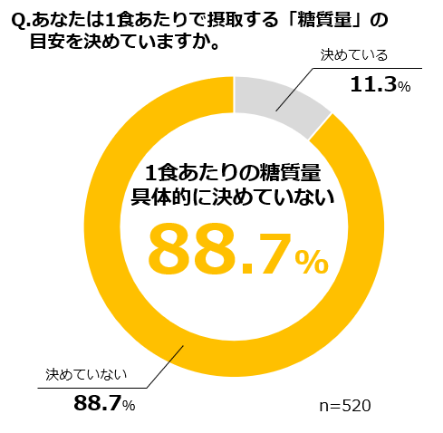 糖質摂取量の目安がない人は88.7%、タンパク質摂取量の目安がない人は86.0%