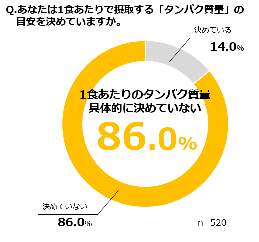 栄養量が自分の目安に合えば食べたいという人がいる一方で、実際に1食あたりの「糖質量」と「タンパク質量」の目安を聞いたところ、糖質量は88.7%、タンパク質量は86.0%の人が具体的な摂取目安量を決めていないと答えました。