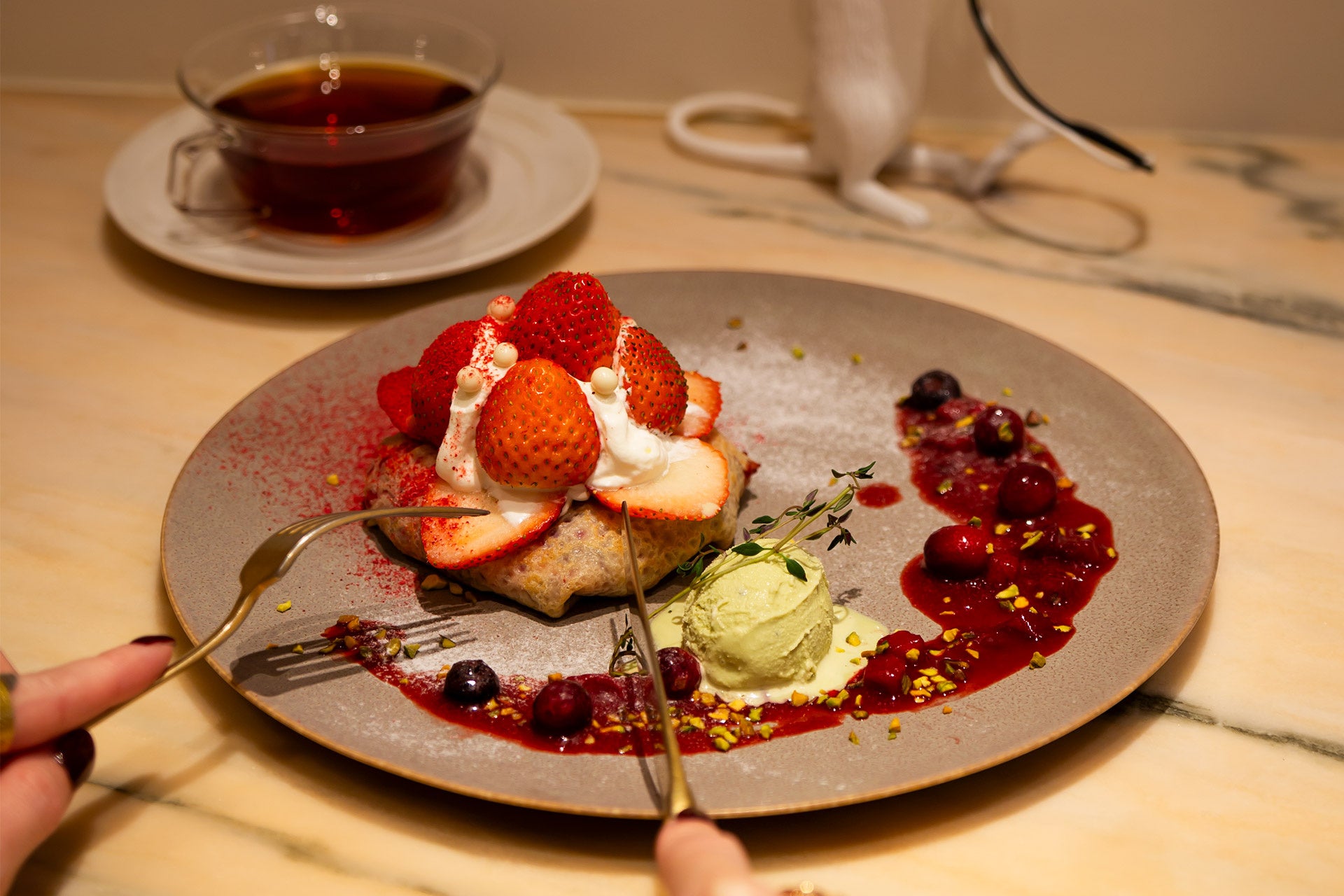 コクのあるピスタチオのアイスを合わせることで、より苺の甘みを感じられる味わいに。