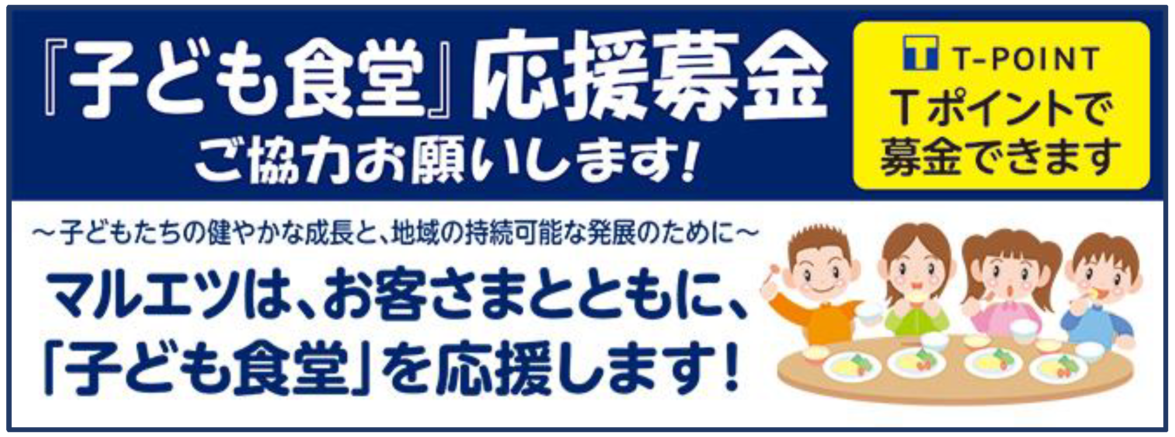 また、マルエツでは、子どもたちが安心できる居場所や地域とのつながりを提供する「子ども食堂」を応援するため、全店舗に募金箱を設置し、子ども食堂応援募金を実施しています。