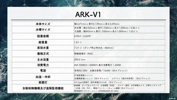 ARK(アーク)は「養殖の民主化」をミッションとして「どこでも誰でも水産養殖ができる仕組み」を提供するため小型・分散型のCRAS(Closed Recirculating Aquaculture System)と呼ばれる閉鎖循環式陸上養殖システム「ARK」等の開発・販売をおこなっています。既存の大規模養殖システムとは異なり、小規模な投資と運用で分散型の水産養殖を始めることができます。また再生可能エネルギーを活用することでオフグリッドでの稼働が可能であると同時に、大幅にエネルギーコストと環境負荷を削減することができます。これらのハードウェアに加えて、養殖事業に必要となるリモート管理アプリケーション「STARBOARD BY ARK」、資材や種苗、飼育ノウハウを提供しています。