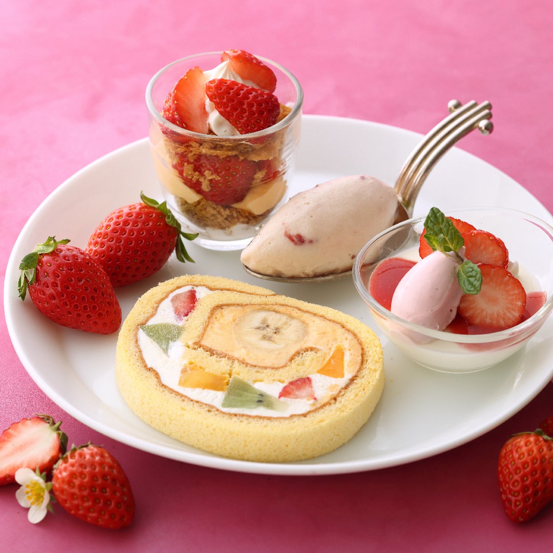 なめらかなパンナコッタにフレッシュ苺をあわせた「苺とココナッツのパンナコッタ」や淡いピンク色の「苺のアイス」も新しくラインアップに加わり、見た目も味わいも春らしいアフタヌーンティーに仕上がっています。