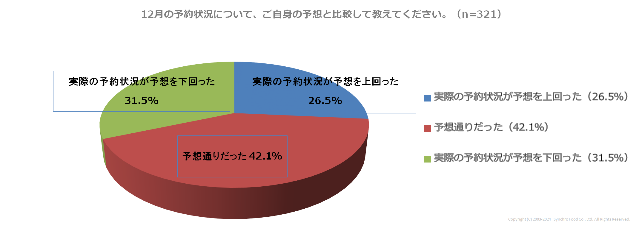 続いて、予約を受け付けていると回答した方に、12月の予約状況について自身の予想と比較してもらいました。すると、最も多かったのは「予想通りだった」との回答で42.1%。このほか、「実際の予約状況が予想を下回った」が31.5%、「実際の予約状況が予想を上回った」が26.5%となっており、店舗ごとに状況が分かれる結果となりました。