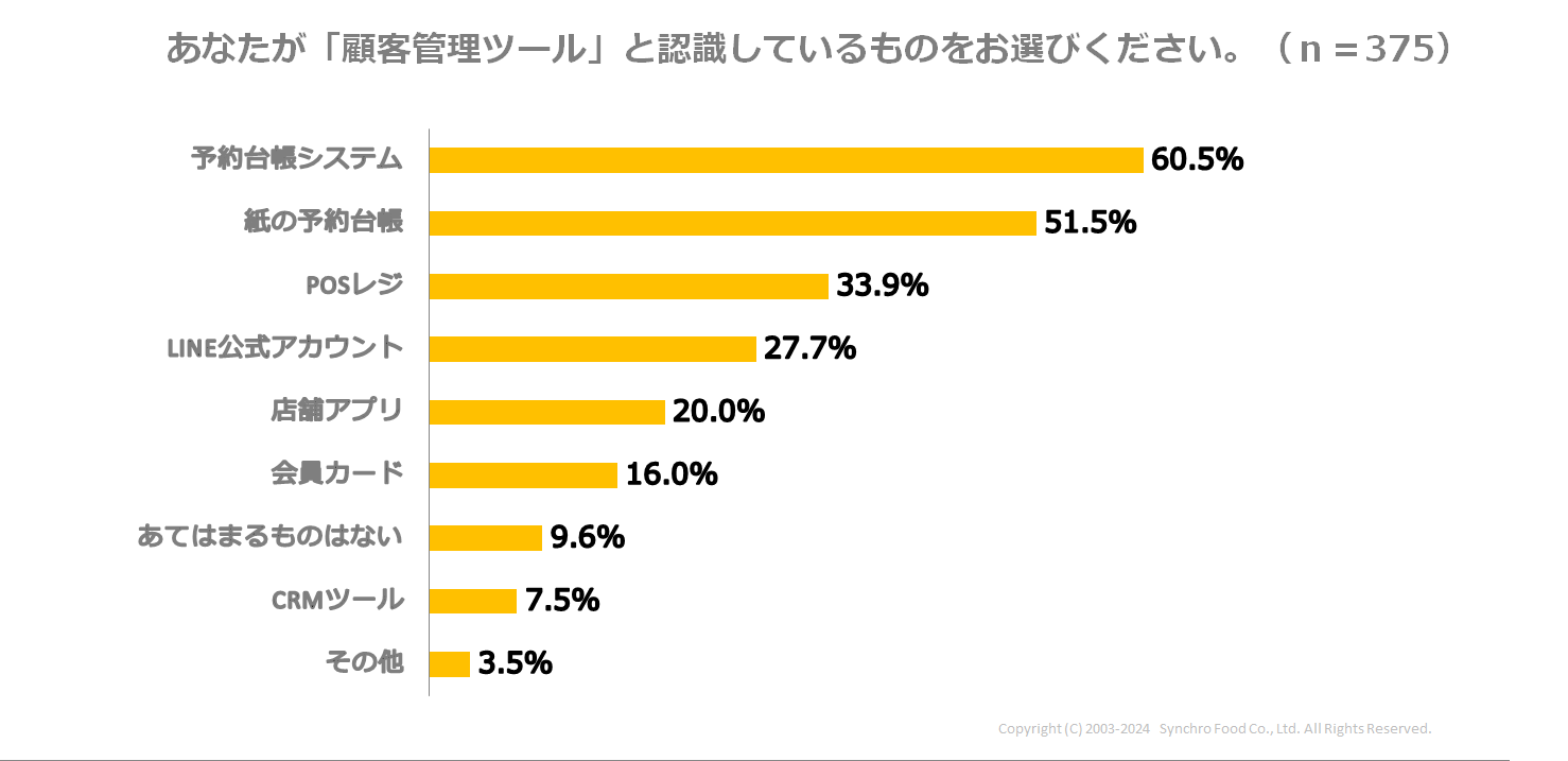 続いて、顧客管理ツールと認識しているものをすべて選んでもらったところ、最も多かったのは「予約台帳システム」との回答で60.5%。次いで、「紙の予約台帳(51.5%)」と続きました。この結果からは、予約台帳を顧客管理ツールとして認識、兼用している方が多いことがわかります。