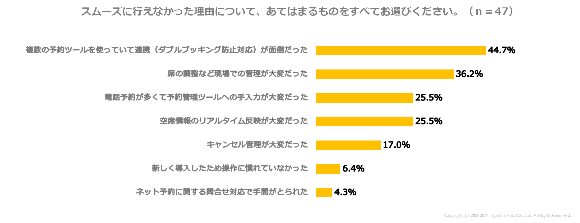 そこで、「おおむねスムーズにできたが、やや手間どった」、「いいえ(スムーズではなかった)」と回答した方に、その理由を答えてもらったところ、44.7%が「複数の予約ツールを使っていて連携(ダブルブッキング防止対応)が面倒だった」と回答。このほか、「席の調整など現場での管理が大変だった(36.2%)」、「空席情報のリアルタイム反映が大変だった(25.5%)」、「電話予約が多くて予約管理ツールへの手入力が大変だった(25.5%)」との回答も目立ちました。