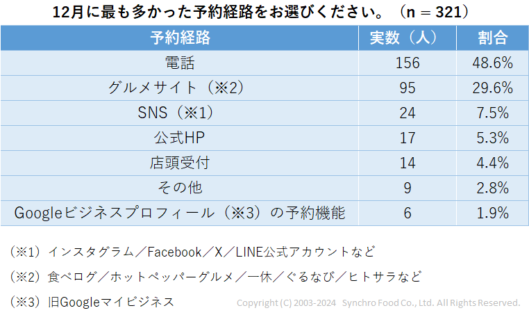 48.6%の飲食店が「電話からの予約が最も多かった」と回答