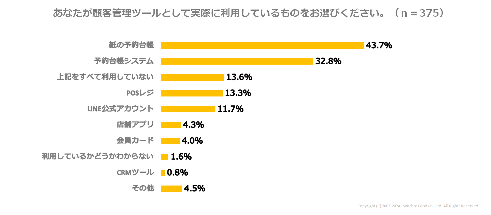 さらに、実際に活用している顧客管理ツールを尋ねると、43.7%が「紙の予約台帳」と回答しており、紙ベースでの管理が最多でした。次いで「予約台帳システム(32.8%)」との回答が続きました。