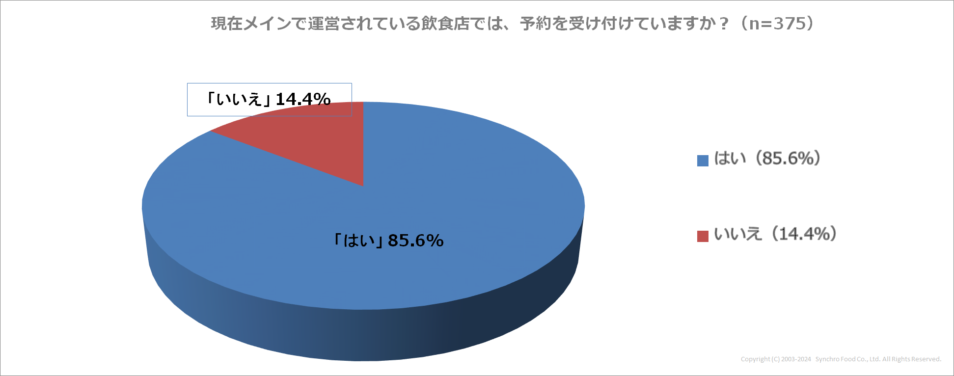 はじめに、現在メインで運営している飲食店で、予約を受け付けているか尋ねたところ、「はい」が85.6%、「いいえ」が14.4%と、8割以上の店舗で予約を受け付けていることがわかりました。