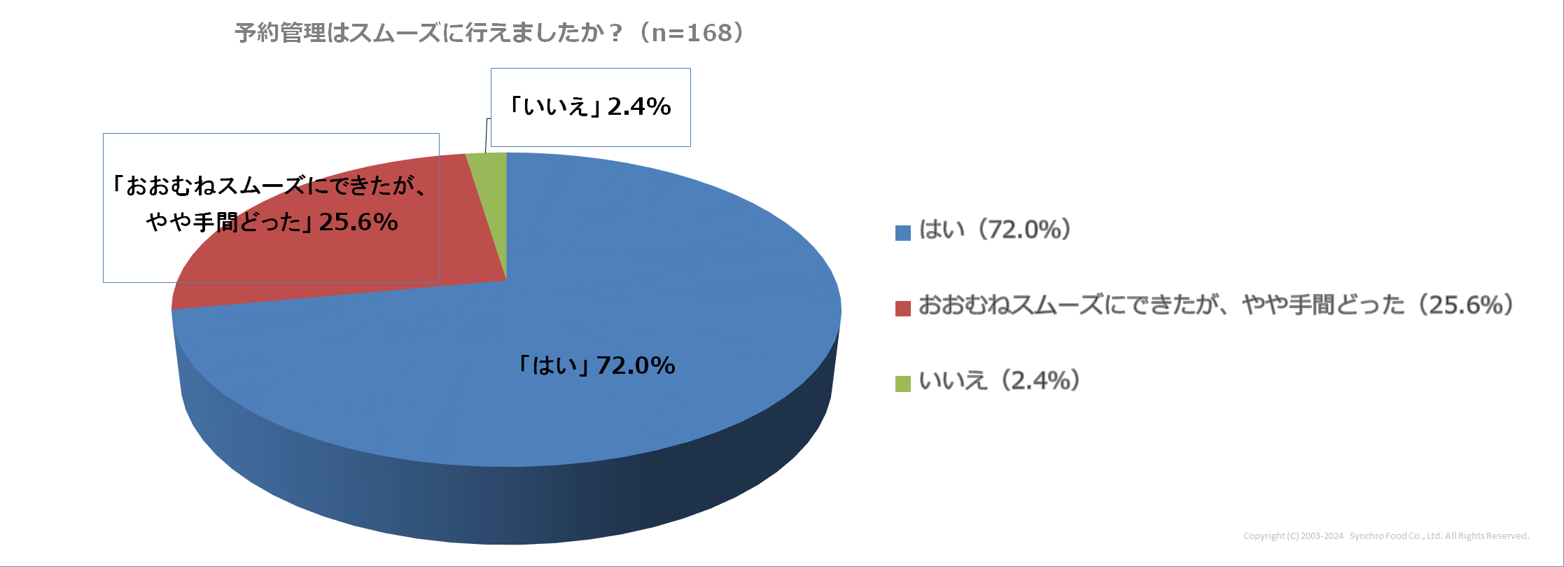 さらに、予約管理ツールを利用していると回答した方に、スムーズに予約管理できたか質問しました。すると、72.0%が「はい」と回答した一方で、「おおむねスムーズにできたが、やや手間どった」が25.0%、「いいえ」が2.4%と、28.0%の店舗は予約管理ツールの利用に手間どったことが明らかとなりました。