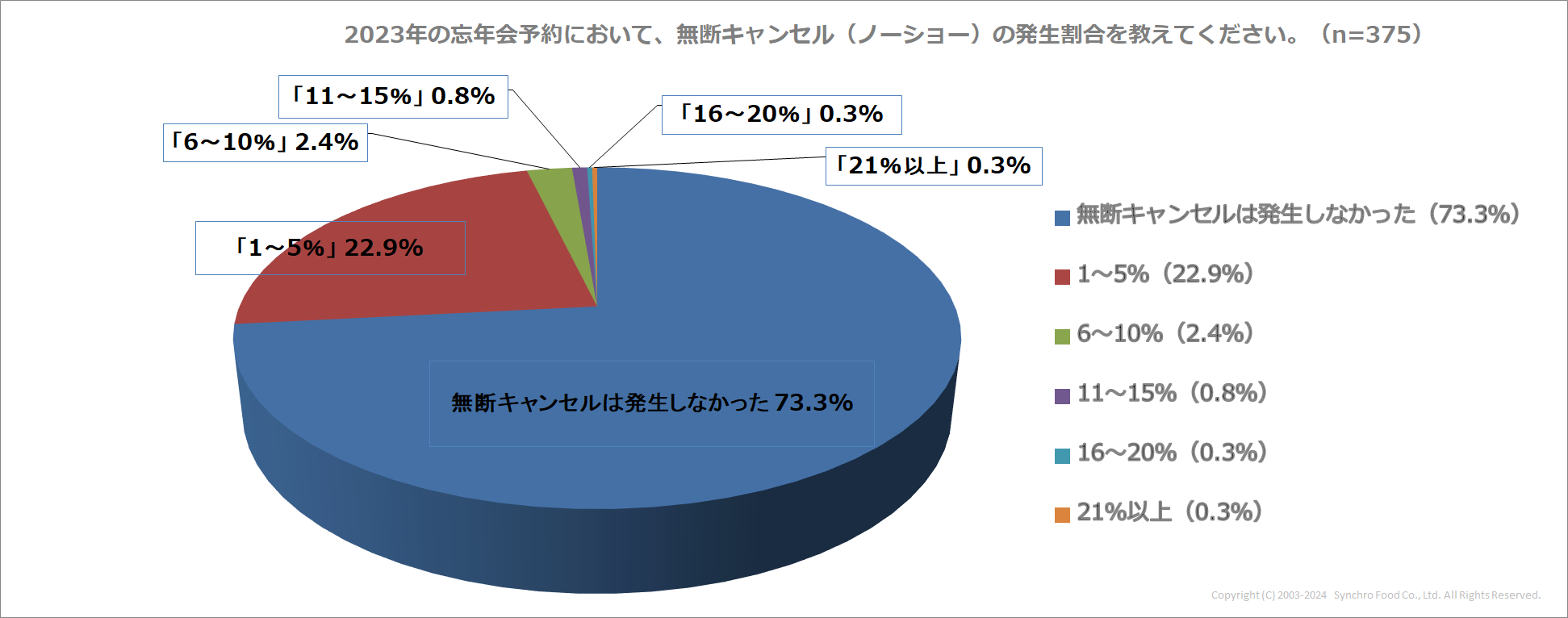 最後に、2023年の忘年会予約における、無断キャンセル(ノーショー)の発生割合を答えてもらいました。すると、73.3%が「無断キャンセルは発生しなかった」と回答。しかし、全体を見ると、26.7%の店舗で無断キャンセルが発生しており、昨年の忘年会だけでも決して少なくない数の店舗が被害を受けている状況が明らかとなりました。