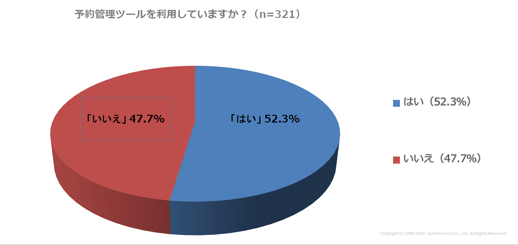 次に、予約を受け付けていると回答した方に、予約台帳などの管理ツールを利用しているか尋ねたところ、52.3%が「はい」、47.7%が「いいえ」と回答しており、半数を超える店舗が何らかの予約管理ツールを利用していることがわかりました。