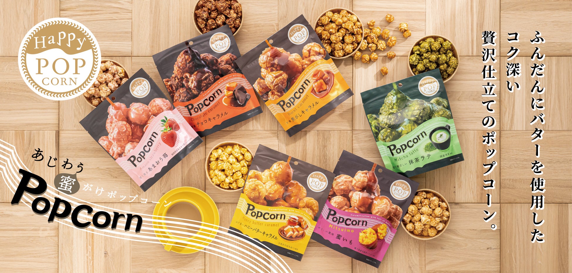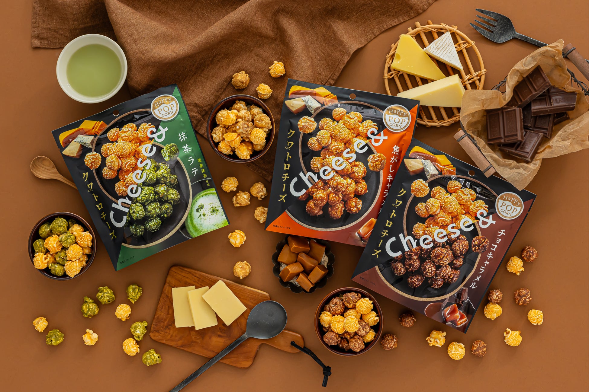 バターをたっぷり使用した甘い蜜を、一粒一粒余すところなくキャラメライズした『ハッピーポップコーン』シリーズに、4種類のチーズを使用したクワトロチーズ味のポップコーンをミックスした商品『ハッピーポップコーン クワトロチーズ』3品が新登場。”甘い”と”しょっぱい”がループする禁断の味わいを実現しました。