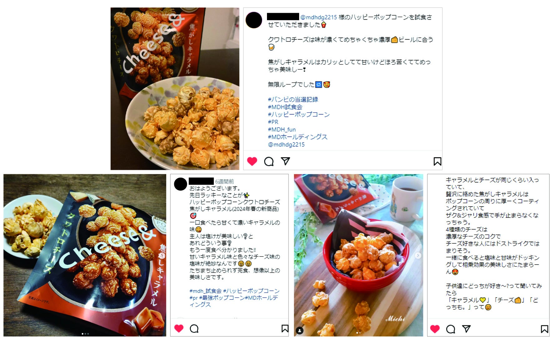 発売前に、当社のInstagram公式アカウントで開催したオンライン試食会(モニター)では、高評価を獲得。「大人も子どもも楽しめた!」「ポップコーンのさくさくとした食感と、じゅわっと広がるチーズの旨みがやみつきになる」「甘いとしょっぱいのループが止まらない!」といった口コミが寄せられました。また、チャック付きのパッケージで利便性も高く、お家時間を充実させるためのスナックとして最適なアイテムとして評価されています。