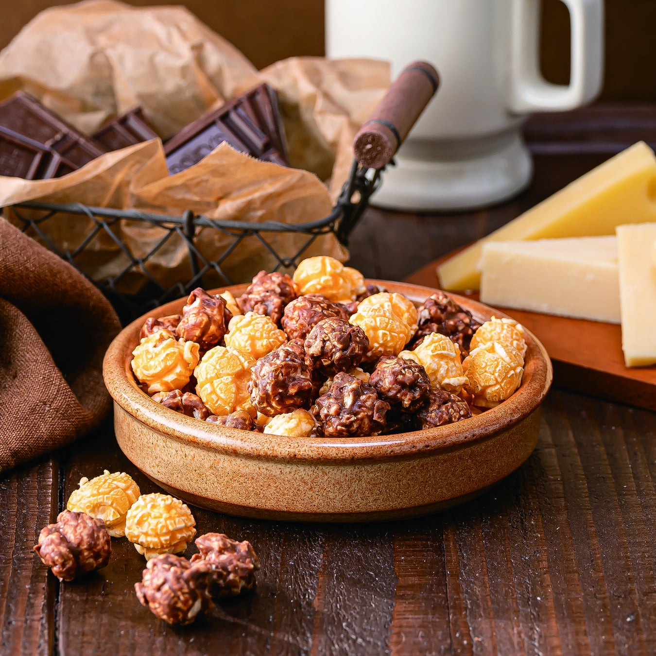 本商品は、チェダーチーズ、ブルーチーズ、ゴーダチーズ、パルメザンチーズの4種類のチーズを使用したクワトロチーズ味のポップコーンと、クワトロチーズ味と相性のいい『焦がしキャラメル』『チョコキャラメル』『抹茶ラテ』それぞれ3種類のフレーバーを甘くキャラメルライズしたポップコーンをミックス。