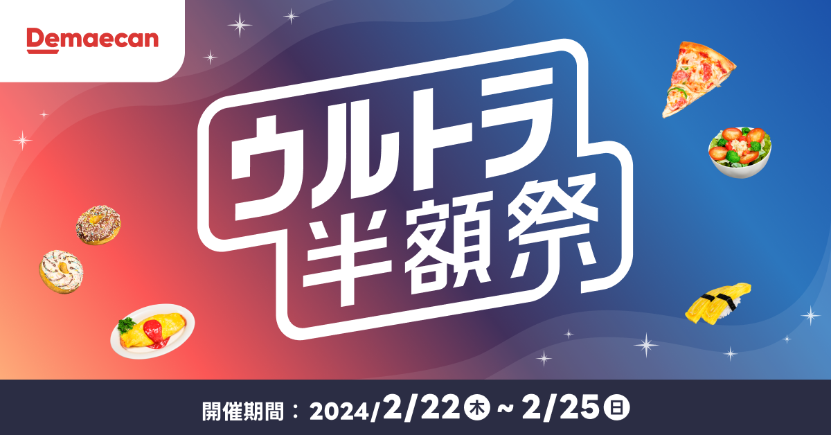 株式会社出前館(本社:東京都渋谷区、代表取締役社長:藤井英雄)は、運営する日本最大級のデリバリーサービス『出前館』において、対象商品が通常価格の50%OFFでご注文いただける「ウルトラ半額祭」を2024年2月22日(木)から4日間で開催いたします。