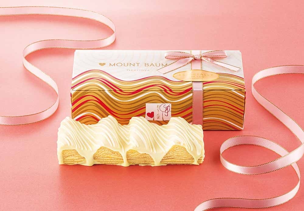 ねんりん家の代表作「マウントバーム しっかり芽」に、ホワイトショコラを一面にとろりと流しかけた、スペシャリティな一品。ねんりん家がこだわり続けるバターリッチな味わいと、くちどけの良いミルクのコクが繊細に重なり合う特製バームクーヘンです。その上からさらに、流麗なミルキーラインでドレスアップ。ホワイトデーにふさわしい“白い山並み”と、特別な日にぴったりなリボンの装いで、皆様においしい思い出をお届けいたします。