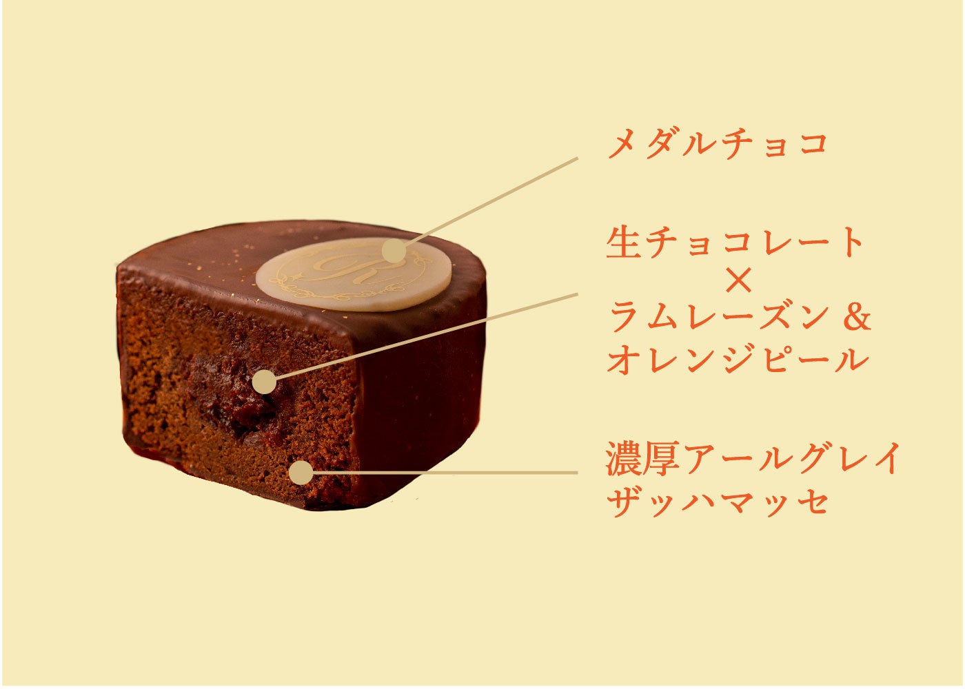 ブランドのロゴをあしらい、周りに金箔を散らすことで月のような優しい輝きを表現しています。ラムレーズンのまろやかな甘味に、柑橘の爽やかさとアールグレイの深みが絶妙に溶けあう【ラムーン・ザッハトルテ】の新作は、まさに『香りを味わうスイーツ』です。独自の組み合わせと贅沢な素材が織りなす、口福でユニークな味わいを是非お楽しみください。