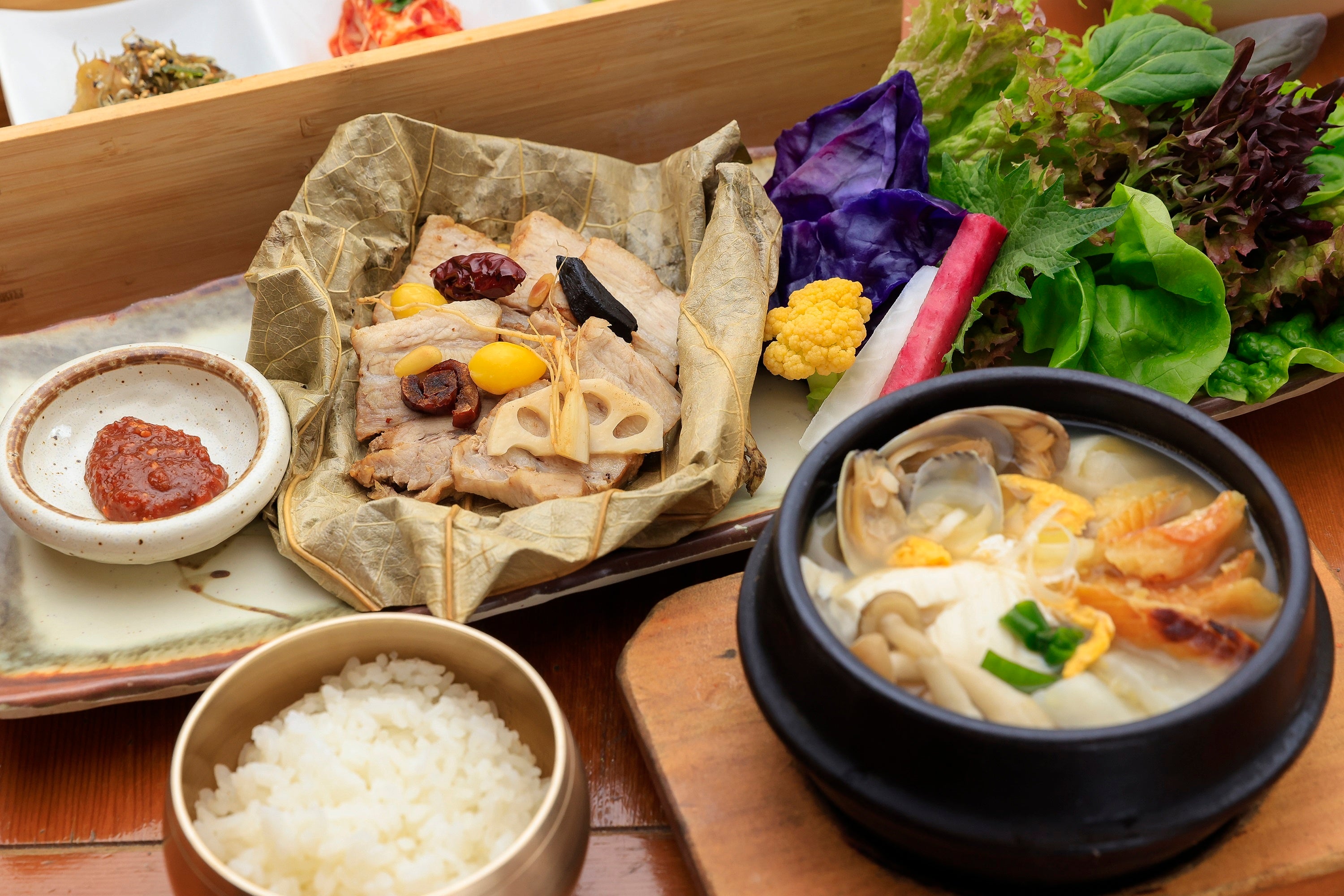 メニュー名 :蓮の葉包み 韓方ポッサムとプゴク(干しダラスープ)セット