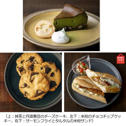 また、 2月20日(火)よりAKOMEYA食堂 神楽坂にて、「抹茶と丹波黒豆のチーズケーキ」や「サーモンフライとタルタルの米粉サンド」「米粉のチョコチップクッキー」といった米粉を使用したメニューを販売します。