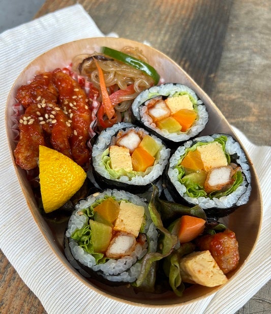 麦の家の人気キンパや、ヤンニョンチキンやチャプチェなど、日替わり韓国惣菜がいろいろ詰まった、