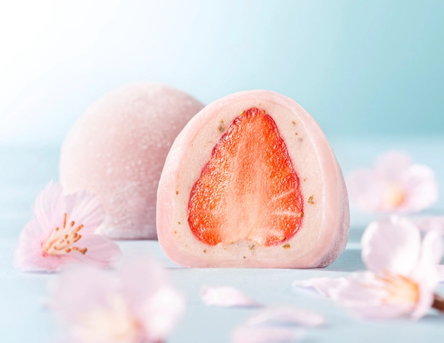 桜いちご大福に使用している紅ほっぺは甘味が強く酸味も適度にあるため、苺本来の甘酸っぱさを堪能できる品種です。この時期は果実が熟し、甘みが増してきます。亀屋万年堂の大福は、苺の風味やジューシーさを余すことなく味わえるよう、苺を一粒まるごと使用し、餡と餅で苺を包む製法にこだわっています。