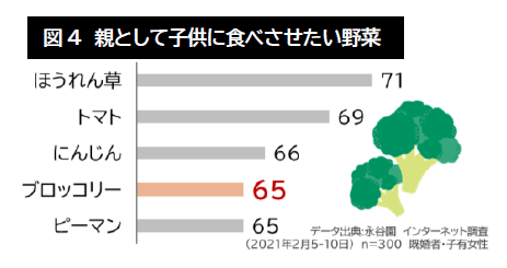 本品の基本の作り方は、ブロッコリー(1株、約200g)と豚肉(150g)を加える設計となっています。栄養価が高く苦みも少ないブロッコリーは、親が子供に食べさせたい人気野菜の一つです(図4)。作り方に水を入れてビーフンと具材を煮る工程があるため、ブロッコリーの別茹でが不要なのもうれしいポイントです。