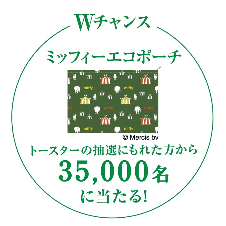 おいしいeco生活キャンペーンでは、対象商品の応募券を5点分集めて応募すると、抽選でオリジナルトースターを5000名様にプレゼントいたします。Wチャンスとして抽選でミッフィーエコポーチを35000名様に当たります。