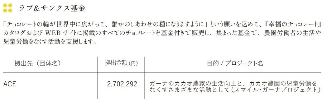 「チョコレートの輪が世界中に広がって、誰かのしあわせの種になりますように」という願いを込めて、カタログ『幸福(しあわせ)のチョコレート®』に掲載のすべてのチョコレートは基金付き商品として販売しています。商品価格の一部は児童労働をなくすための活動やこどもたちの栄養改善につながる活動に運用されます。2022年度はプロジェクトパートナーである認定NPO法人ACEの活動「スマイル・ガーナ プロジェクト」への2010年の支援開始からの拠出総額は31,596,782円となりました。
