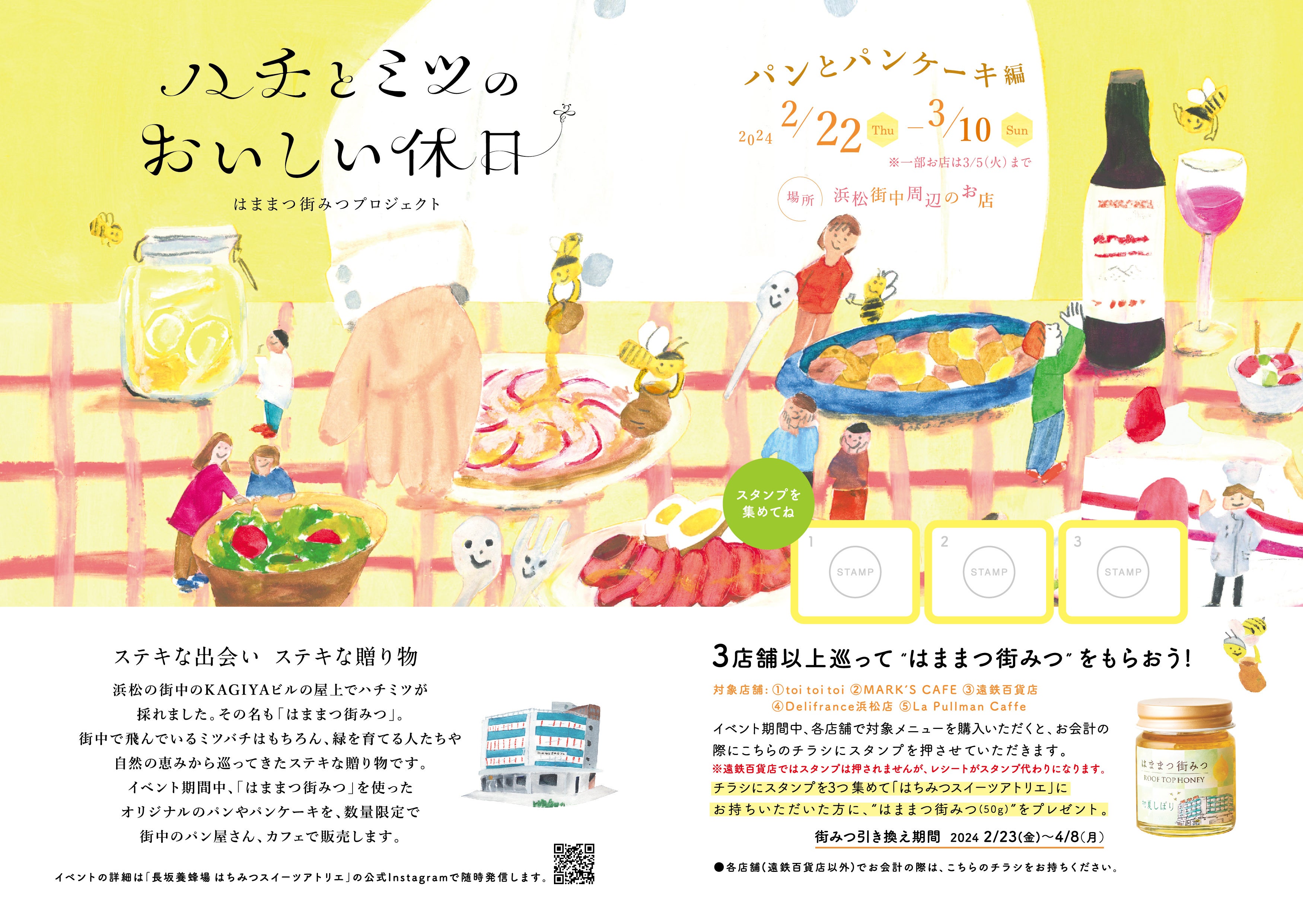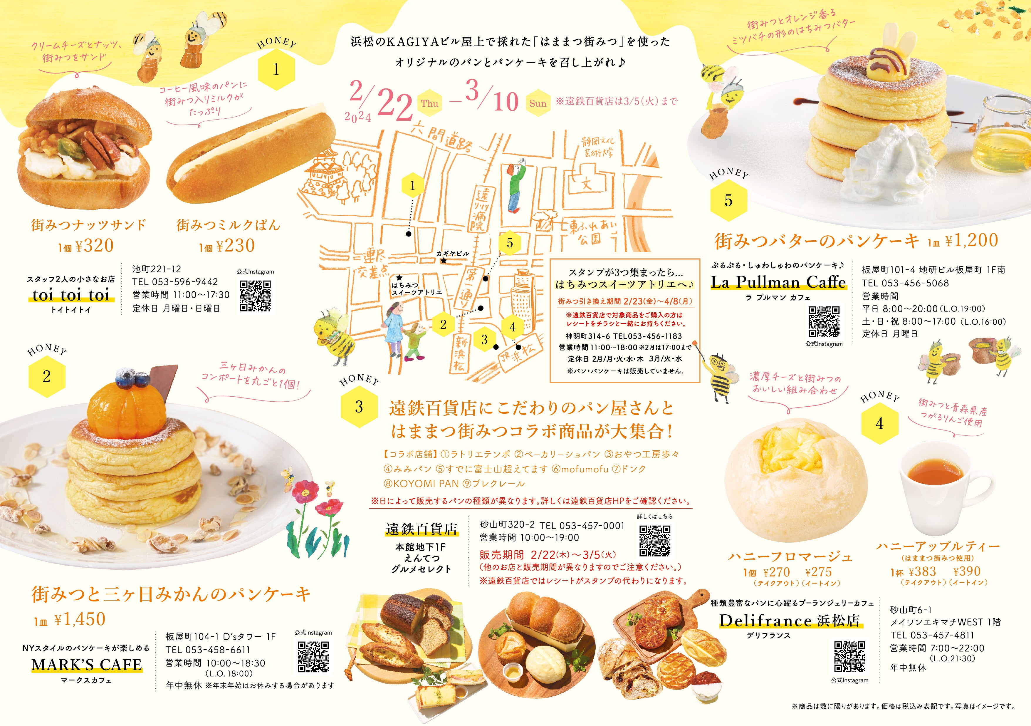 浜松の街中にあるベーカリー2店舗、カフェ2店舗、遠鉄百貨店で、浜松街中のKAGIYAビル屋上で採れた「はままつ街みつ 」を使ったメニュー(パン・パンケーキ)を楽しんでいただき、店舗巡りしていただく企画です。