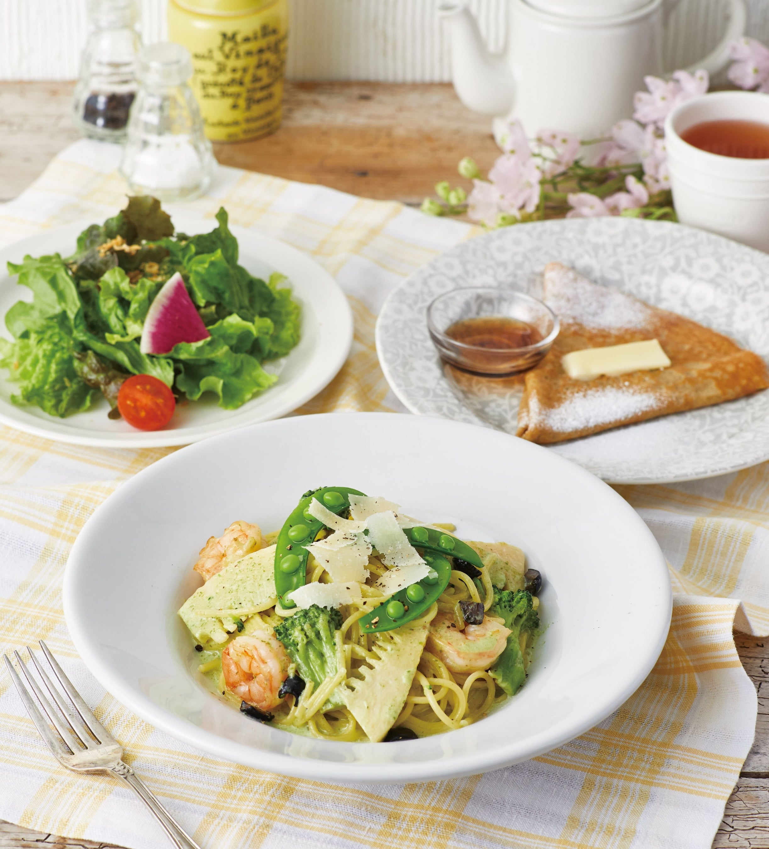 海老や筍、ブロッコリー、オリーブに、ほうれん草のクリームソースを合わせた具沢山なパスタ。