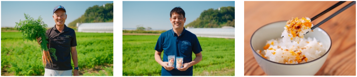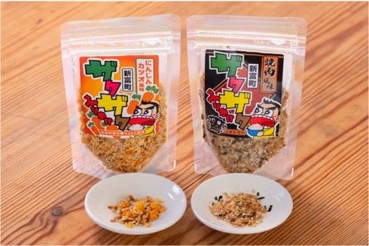 ザクザクふりかけ「焼肉風味」は、JA児湯管内(新富町・高鍋町・木城町)で肥育されたこゆ牛、新鮮なピーマンを使用しています。独自の乾燥技術で粉末化し、ザクザク食感に仕上げています。ガーリックの香りも加わり、まるで焼肉を食べているような風味です。ザクザクふりかけ「にんじんカツオ風味」は、新富町産の安心安全な有機にんじんを使用しています。粉末化した有機にんじんに卵を加え、やさしいカツオ風味とザクザクとした食感が特徴です。