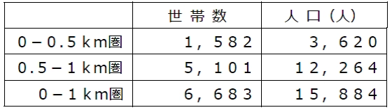 ・店舗から1㎞圏内は、大阪府平均と比較して0~10代、30~50代と3人世帯以上の構成比が高く、ファミリー世帯が多い地域です。