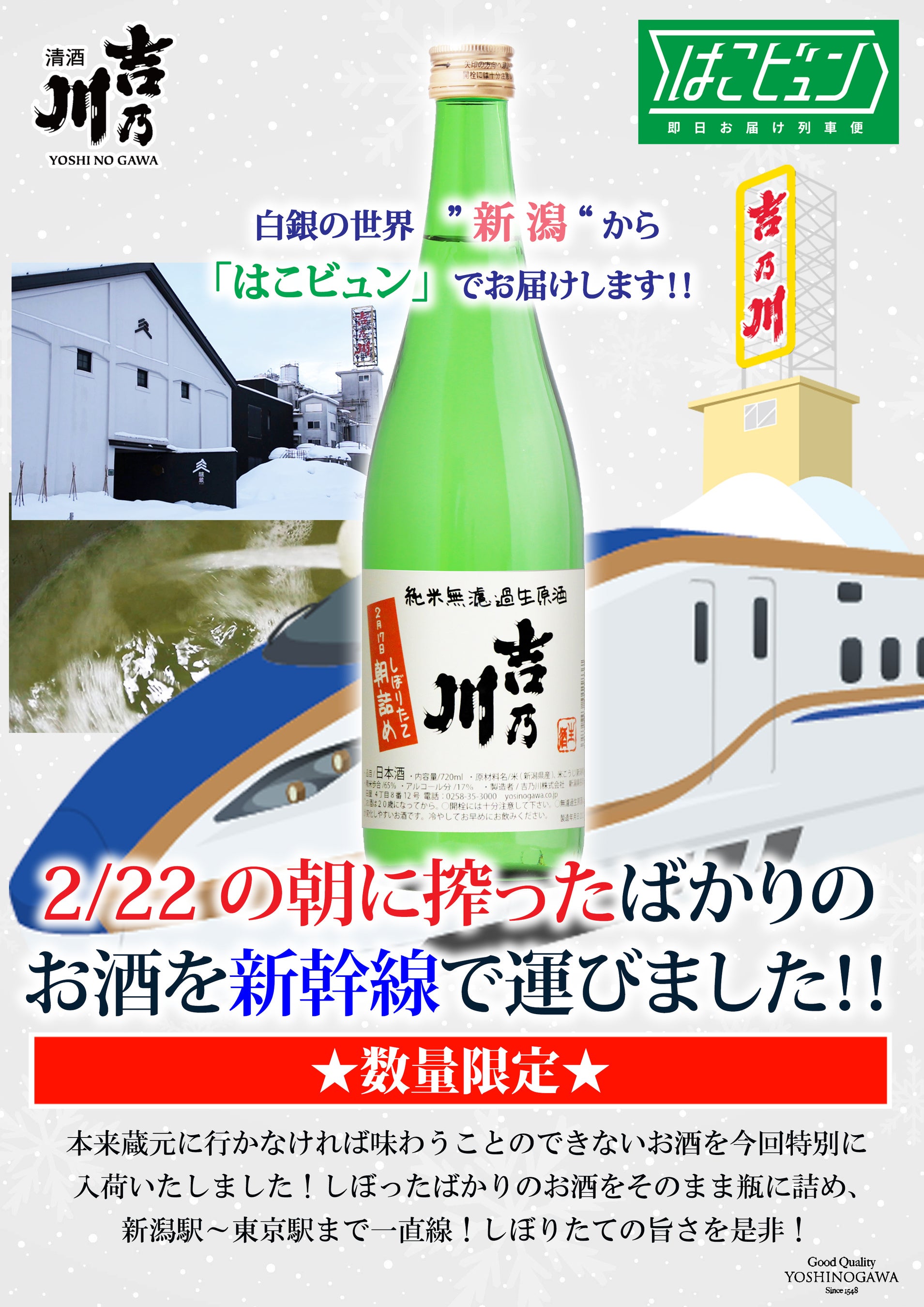 朝しぼりたてのお酒を瓶詰めして、新潟の雪と一緒に新幹線で輸送し、当日午後、東京にお届けします!