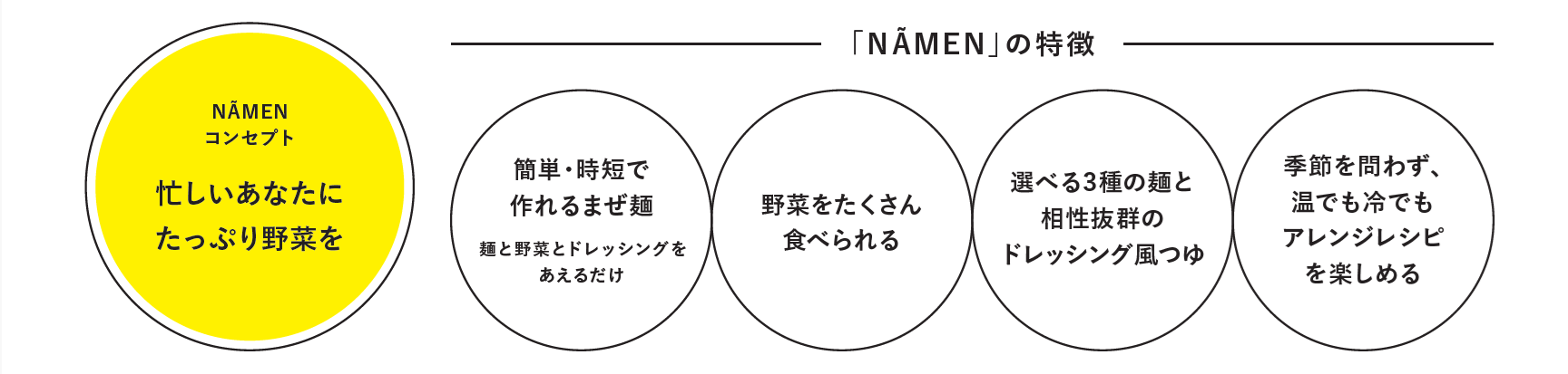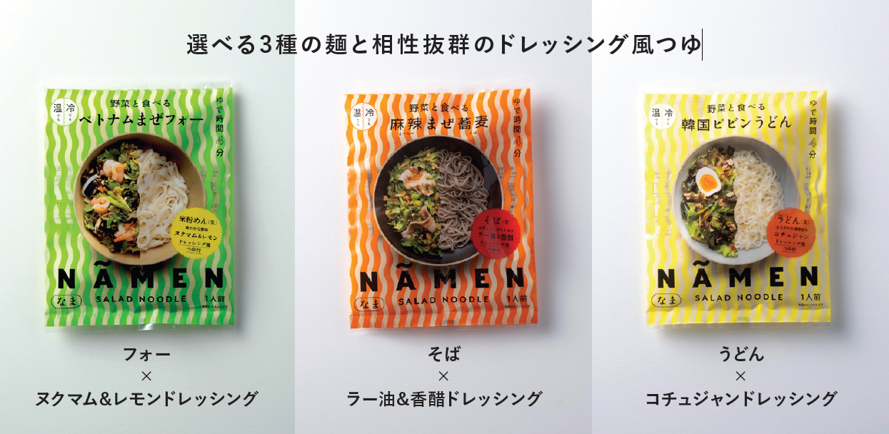 仕事やプライベートで多忙な日々を過ごす中でも、食事は体にやさしいものを食べたい。不規則な生活になってしまった時でも、きちんと栄養バランスのある食事をしたい。「NÃMEN」は、野菜不足を感じている方や健康を意識している方のためのSALAD NOODLE(ヌードル×サラダ)です。簡単・時短調理で、野菜をしっかり摂ることができ、朝食・昼食・夕食・夜食にヘルシーでいつ食べてもぴったり合う。いつでも気軽に手軽に野菜を食べられるだけでなく、「野菜料理やサラダだけでは物足りない」「他にも主食・汁物などをつくる手間がかかる」などのお悩みを、主食である「麺」と組み合わせ、汁気をドレッシングで補うことで、「NÃMEN」だけで完結できるまぜ麺です。栄養価に優れた素材であるそばを作り続けてきた老舗企業だからこそ、そば商品製造の知識・技術を活かしながら「野菜不足」の課題にアプローチし、野菜を食べるヌードルブランドとして新たな発想で開発された麺製品です。